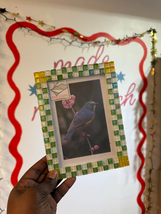 Arrange glass tiles to create exciting designs. You have the option to decorate a picture frame or a set of coasters.