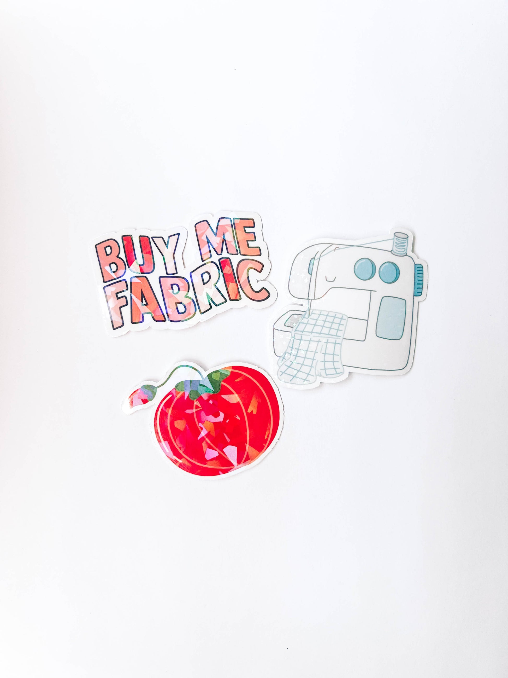 Each pack includes the following sticker designs: Pin cushion, "Buy Me Fabric", Sewing Machine.