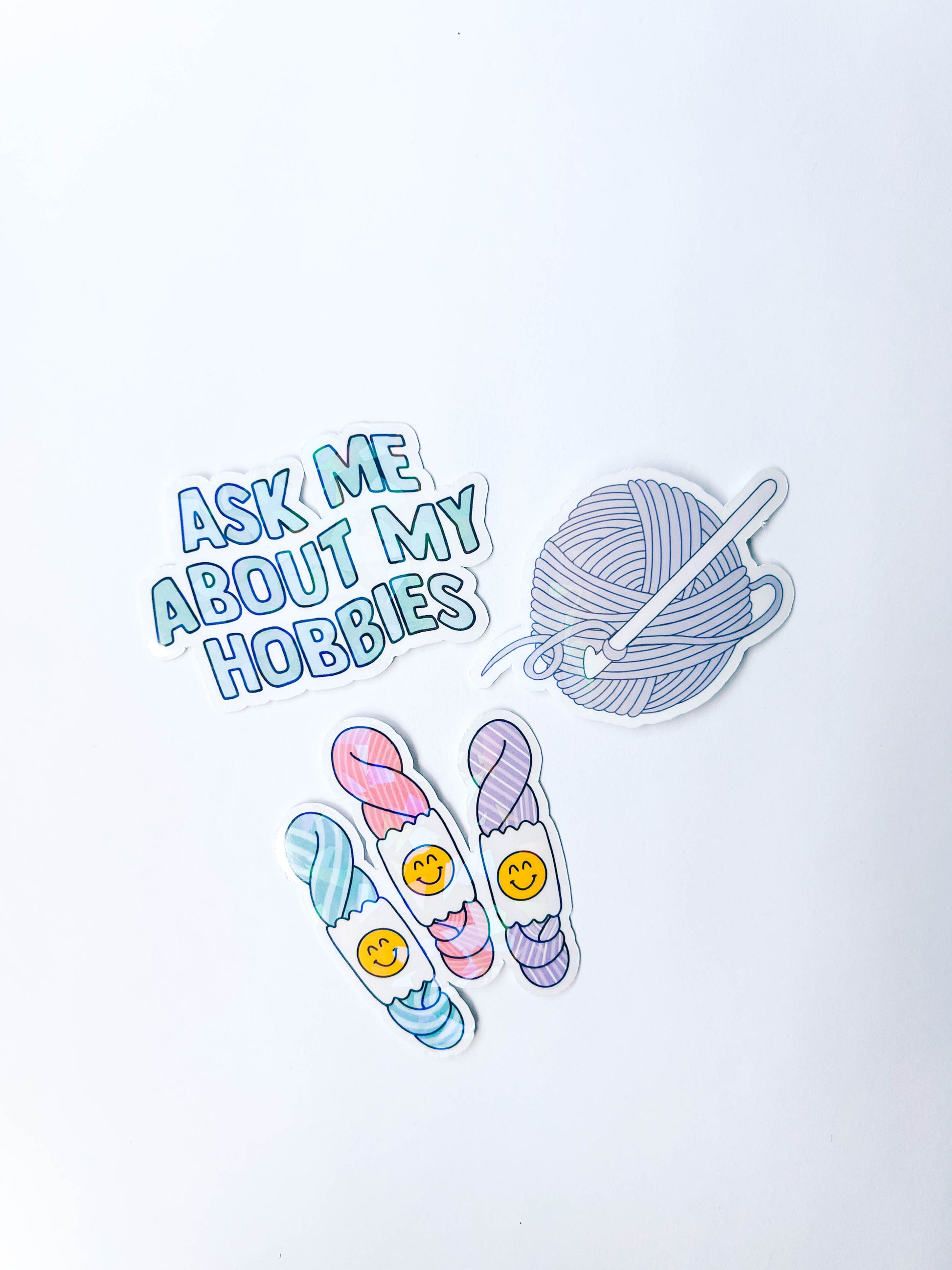 Each pack includes the following sticker designs: Ball of Yarn, Skein of Yarn, "Ask Me About My Hobbies."